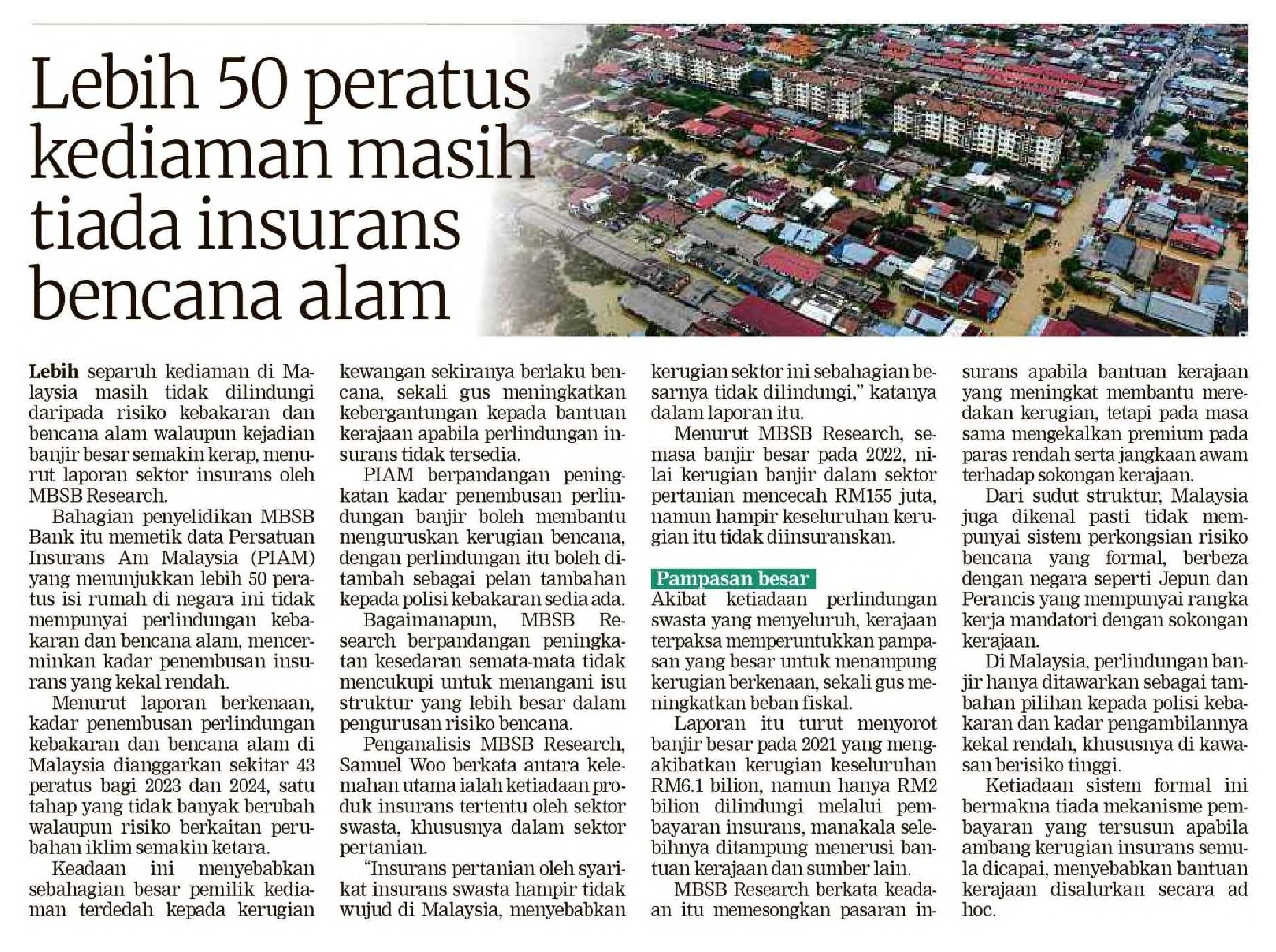 Bahagian penyelidikan MBSB Bank itu memetik data Persatuan Insurans Am Malaysia (PIAM) yang menunjukkan lebih 50 peratus isi rumah di negara ini tidak mempunyai perlindungan kebakaran dan bencana alam, mencerminkan kadar penembusan insurans yang kekal rendah.