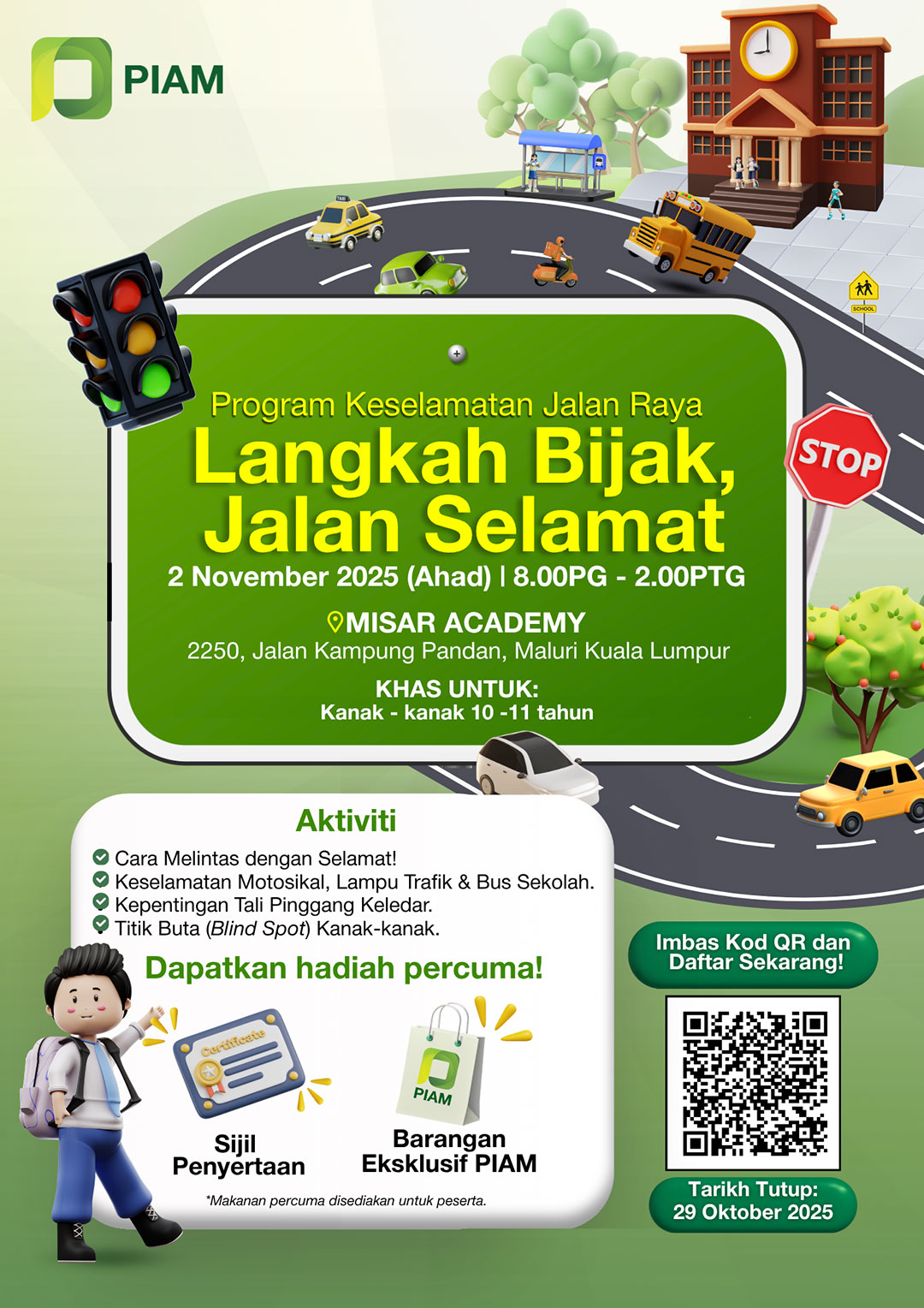 Persatuan Insurans Am Malaysia (PIAM) menganjurkan program percuma terbuka khas untuk murid sekolah yang berumur 10β11 tahun untuk belajar tips keselamatan jalan raya secara hands-on dengan Program Keselamatan Jalan Raya: Langkah Bijak, Jalan Selamat! ππ¦Ί